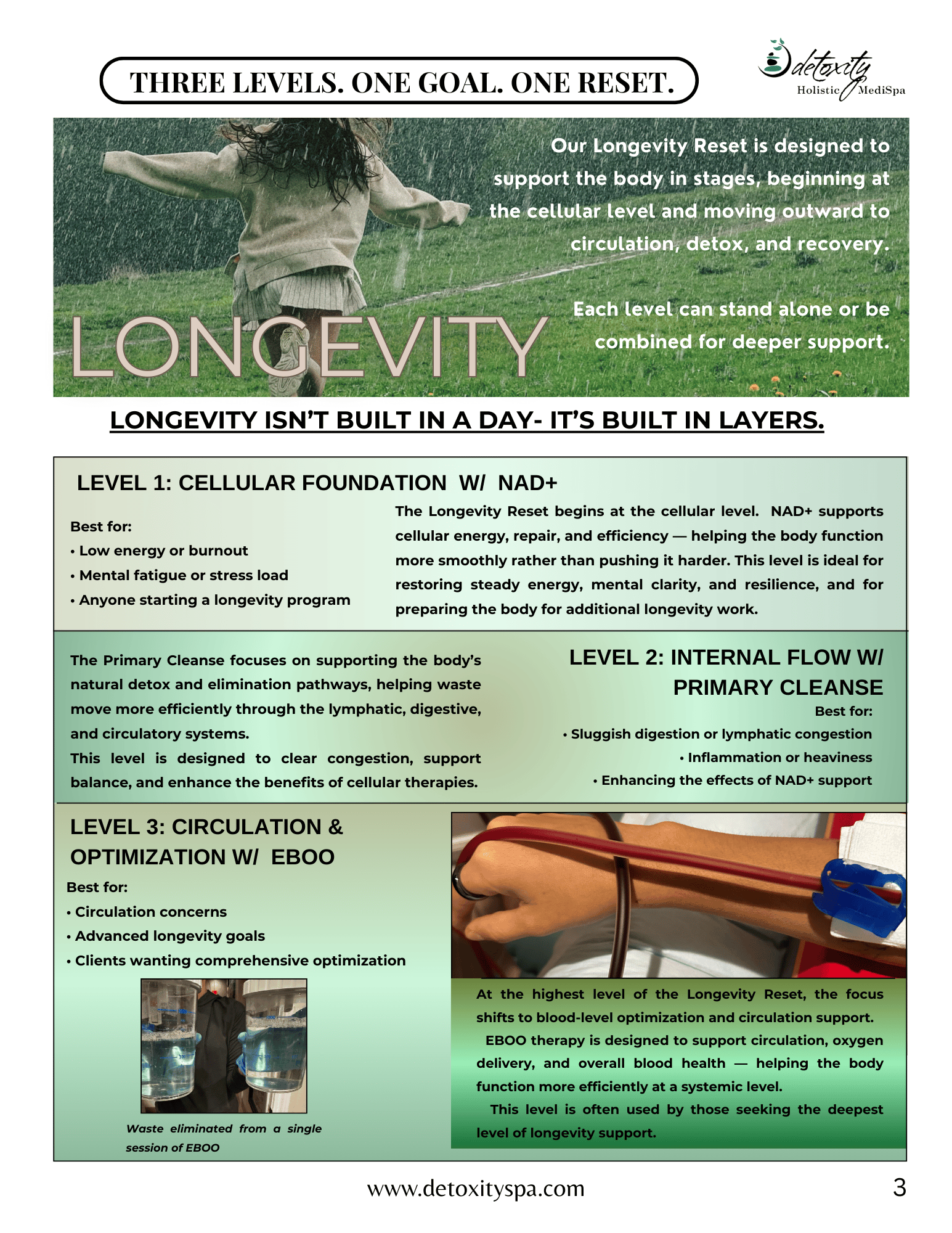 The visual guide below outlines a three-level longevity framework designed to support cellular energy, elimination pathways, and circulation as part of a structured, longevity-oriented wellness approach.